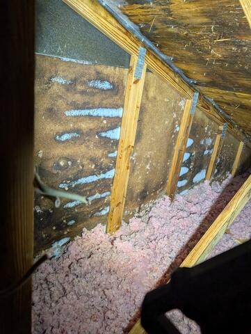 Our customer was facing some serious mold issues!  We were able to identify the underlying cause which in this case was poor and improper ventilation as well as a bathroom fan that wasn't vented/routed outside.  The attic wasn't breathing and warm, humid air was coming in from the bathroom fan. We were able to correct all the culprits and then treat the mold.  In these photos you see the power of RMR-86.  Our spray treatment was able to remediate the mold and take out all the staining as well.  It looks brand new!
